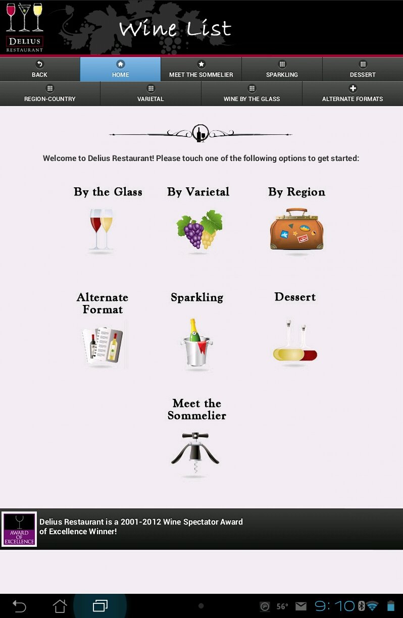 “The Delius e-Wine List on tablets is a comprehensive, digital wine list provided to diners on a sleek Asus Transformer tablet computer. The wine list includes foreign and domestic wines, presented in an easy-to-use format which provides the diner with a wide array of wine choices to compliment every meal at Delius,” stated Richard Bergér, VP of E-Business at ASTRALCOM, the company that developed the e-Wine List, specifically for Delius Restaurant.